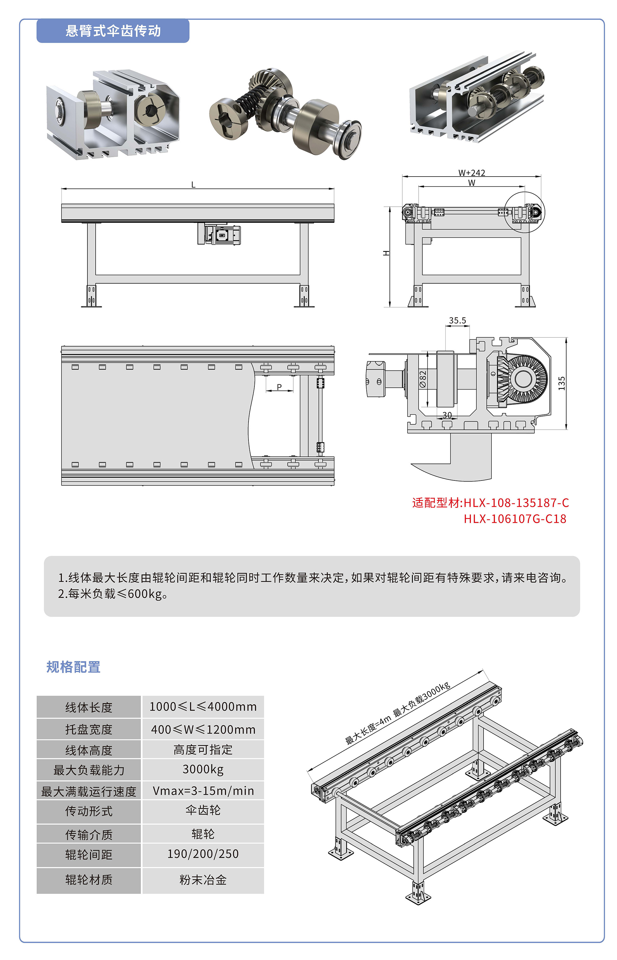 采用135187鋁型材,傘齒驅(qū)動,粉末冶金滾輪鑲嵌銅套實現(xiàn)積放功能,負(fù)載3000kg/米,最大負(fù)載速度15M/min, 輪距190、200、250可選,適用托盤寬度400-1200mm,線體長度范圍1000-4000mm, 高度根據(jù)需求定制.