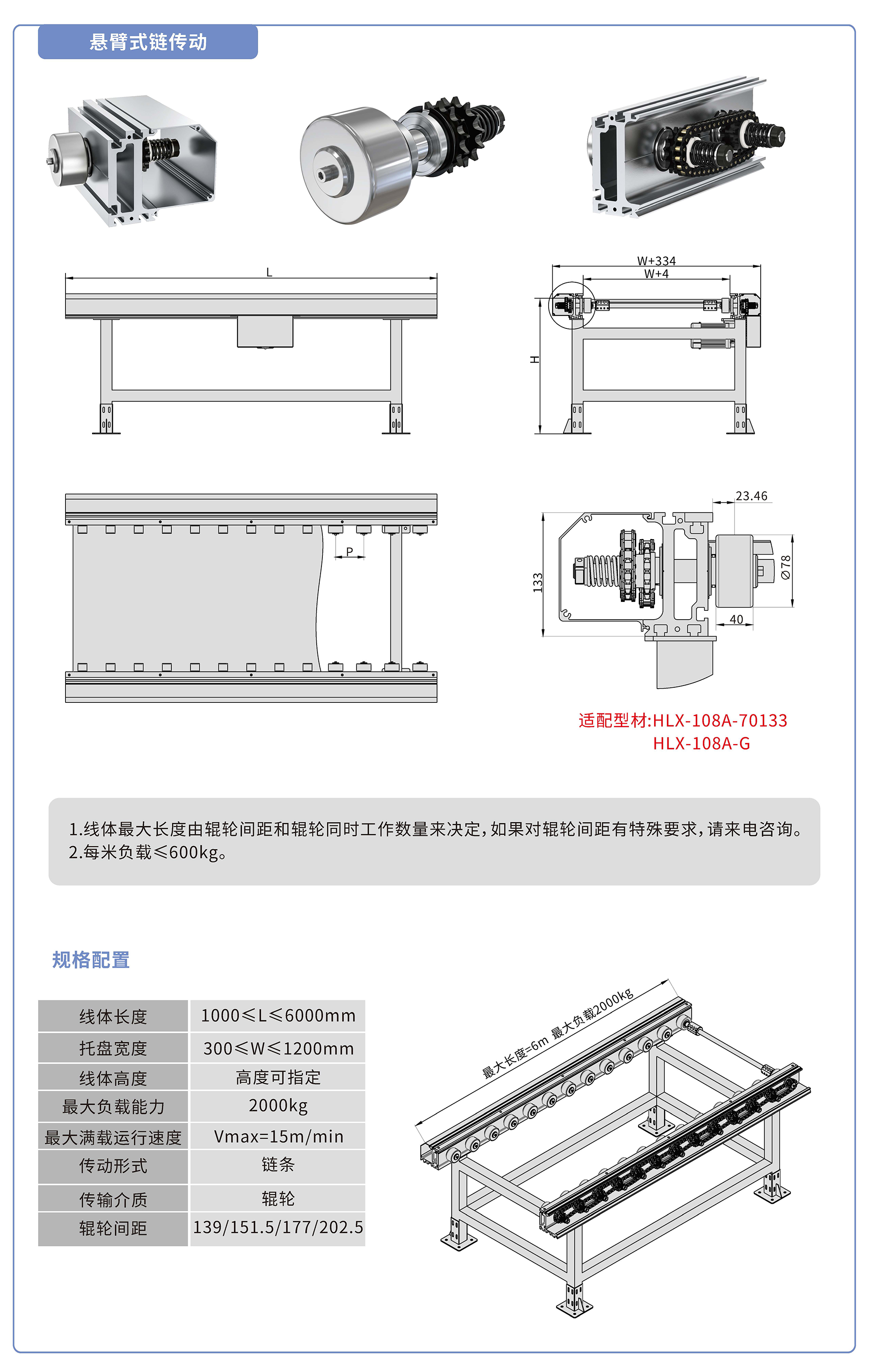 采用70133鋁型材,鏈輪傳動,鍍鉻滾輪鑲嵌銅套實現(xiàn)積放功能,負(fù)載2000kg/米,最大負(fù)載速度15M/min, 輪距139、151.5、177、202.5可選,適用托盤寬度300-1200mm,線體長度范圍1000-6000mm, 高度根據(jù)需求定制.