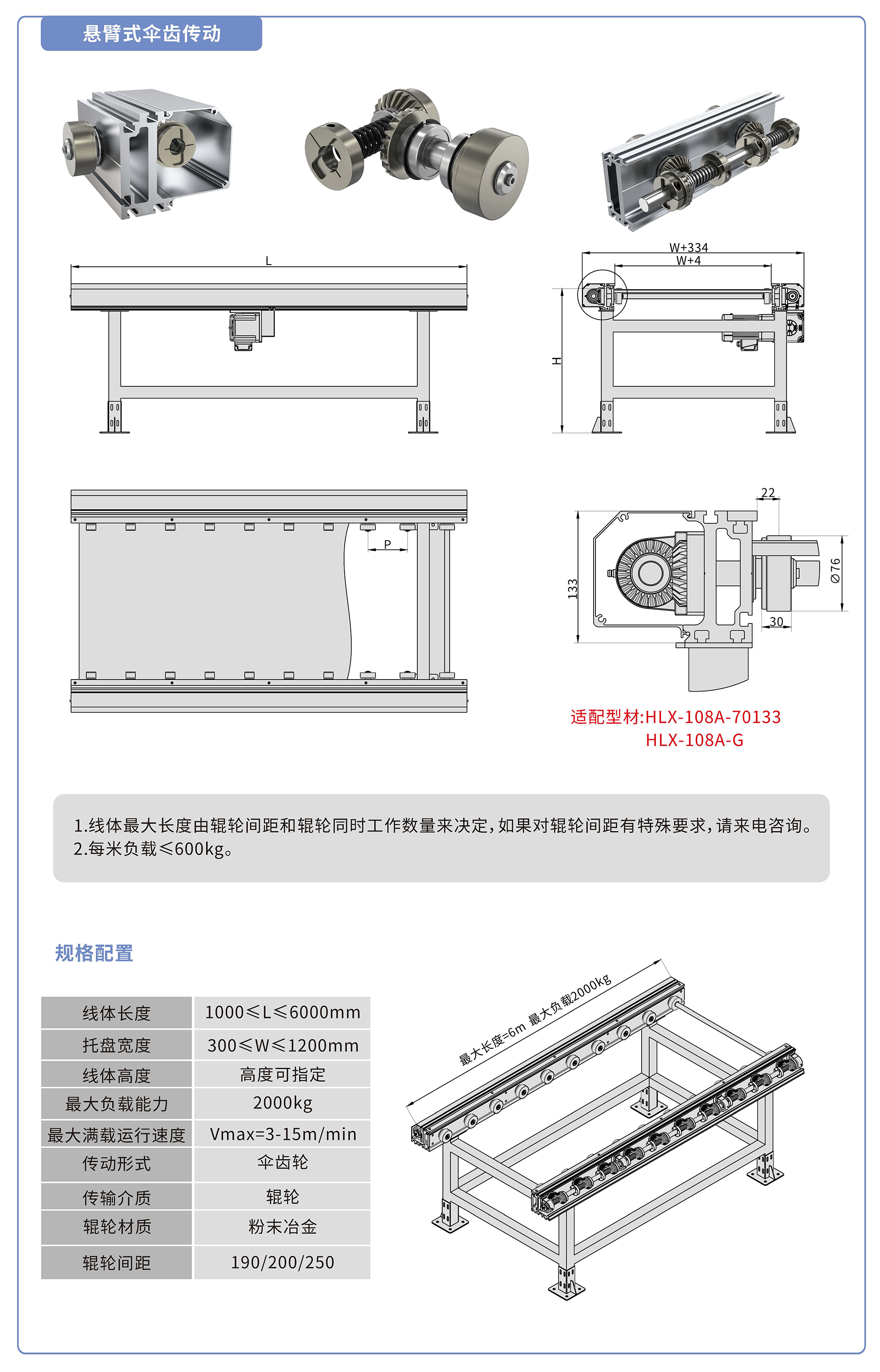 采用70133鋁型材,傘齒驅(qū)動,粉末冶金滾輪鑲嵌銅套實現(xiàn)積放功能,負載2000kg/米,最大負載速度15M/min, 輪距190、200、250可選,適用托盤寬度300-1200mm,線體長度范圍1000-6000mm, 高度根據(jù)需求定制.