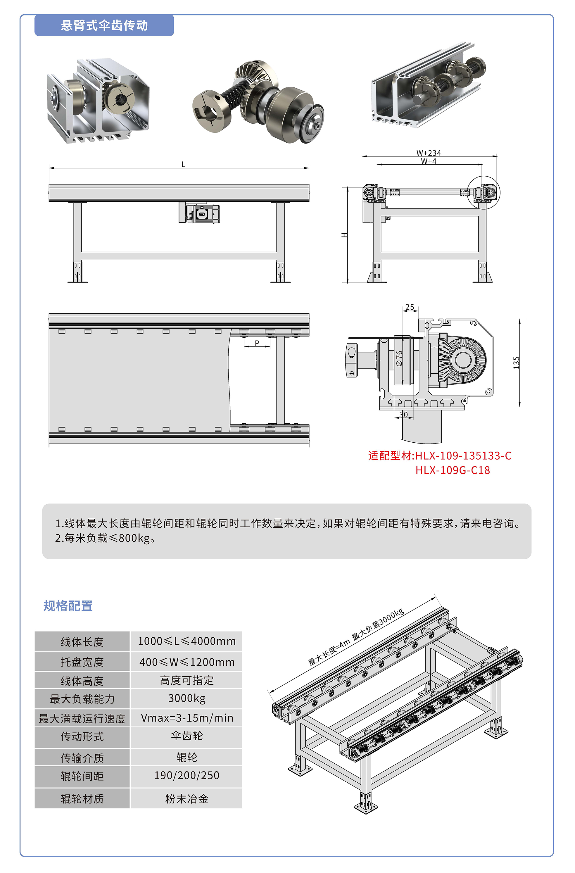 適配135133鋁型材,采用傘齒驅(qū)動,鍍鉻滾輪鑲嵌銅套實現(xiàn)積放功能,負載3000kg/米,最大負載速度15M/min, 輪距190、200、250可選,適用托盤寬度400-1200mm,線體長度范圍1000-4000mm, 高度根據(jù)需求定制.